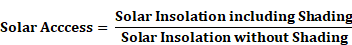 Annual Solar Access is calculated by dividing the total annual solar insolation accounting for shading obstructions by the total annual solar insolation if the same areas were unshaded by obstructions. Annual solar access is determined by a qualified solar assessment tool meeting JA11.4 requirements, explained further in the Solar Access Verification section below.