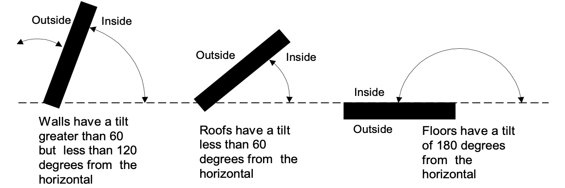 Each surface area is entered along with performance characteristics, including building materials, U-factor, and SHGC. The orientation and tilt (Figure 4: Surface Definitions) are required for envelope elements.