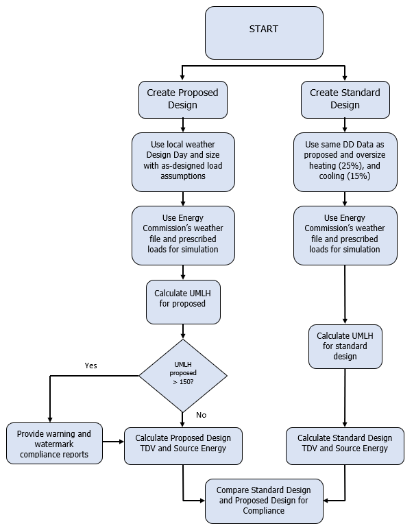 The general calculation procedure is illustrated below in Figure 2: Calculation Process for Title 24 Compliance. The proposed design TDV energy, Efficiency TDV, and source energy use is compared to the standard design and must be equal to or less than the standard design for the project to comply through the performance method.