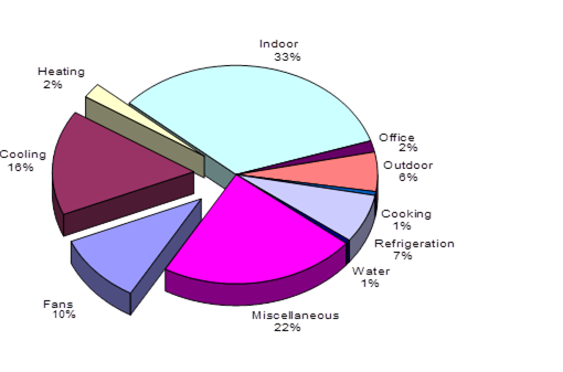 Mechanical and lighting systems are the largest consumers of energy in nonresidential buildings. The amount of energy consumed by various mechanical components varies according to system design and climate. Fans and cooling equipment are the largest components of energy consumed for HVAC purposes in most building in lower elevation climates. Energy consumed for heating is usually less than fans and cooling, followed by service water heating.