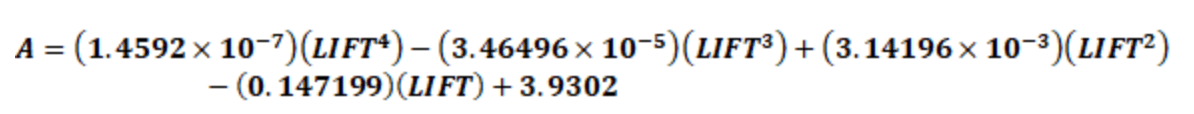 A = (0.00000014592 x (60)4) – (0.0000346496 x (60)3 )+ (0.00314196 x (60)2) – (0.147199 x *(60)) + 3.9302=0.81613
